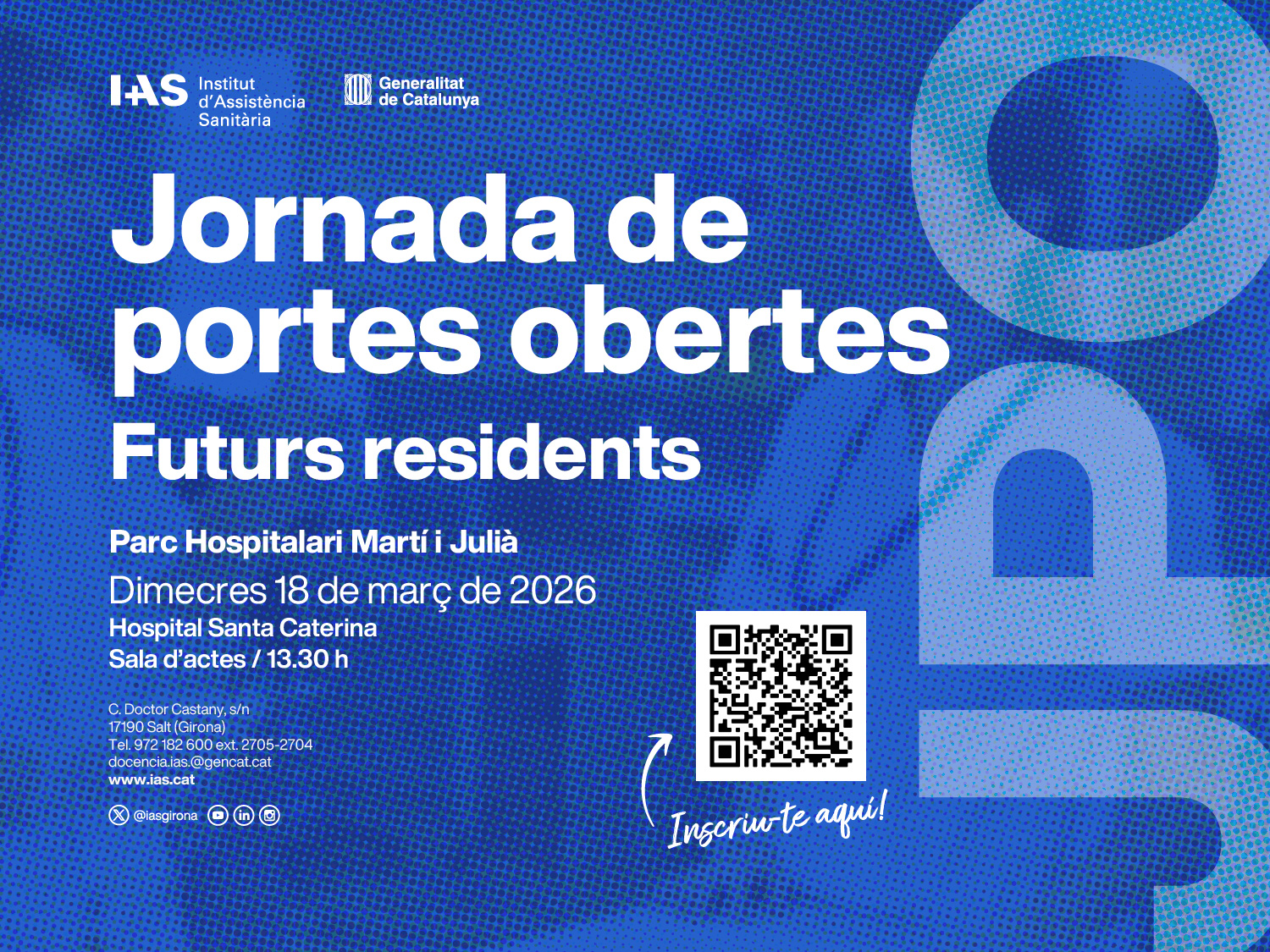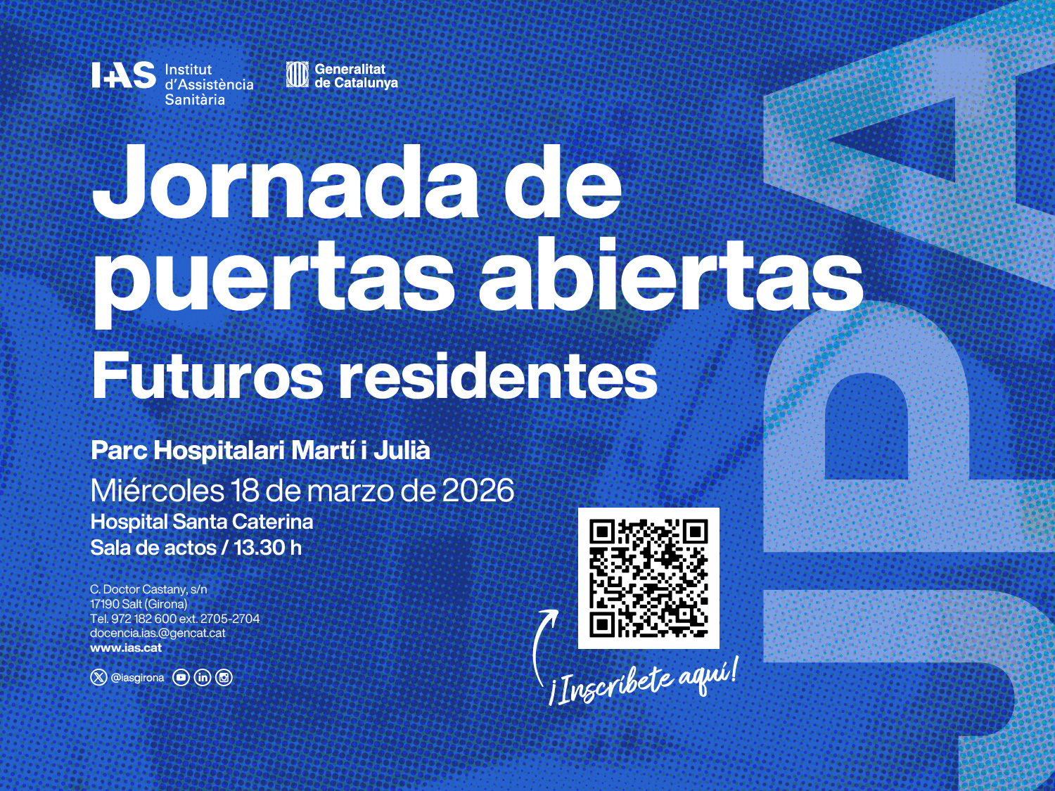 Si esteu valorant la possibilitat de fer la vostra especialització a l’IAS, en primer lloc, moltes gràcies per tenir-nos en compte. Volem que sapigueu que els professionals de la institució estem a la vostra disposició per aclarir-vos qualsevol dubte que tingueu relacionat amb aquesta etapa formativa per tal que estigueu segurs de la vostra elecció. Per això el dimecres 18 de març organitzarem una Jornada de Portes obertes, a les instal·lacions del Parc Hospitalari Martí i Julià de Salt (Girona), campus de salut i recerca, a les 13.30 hores.